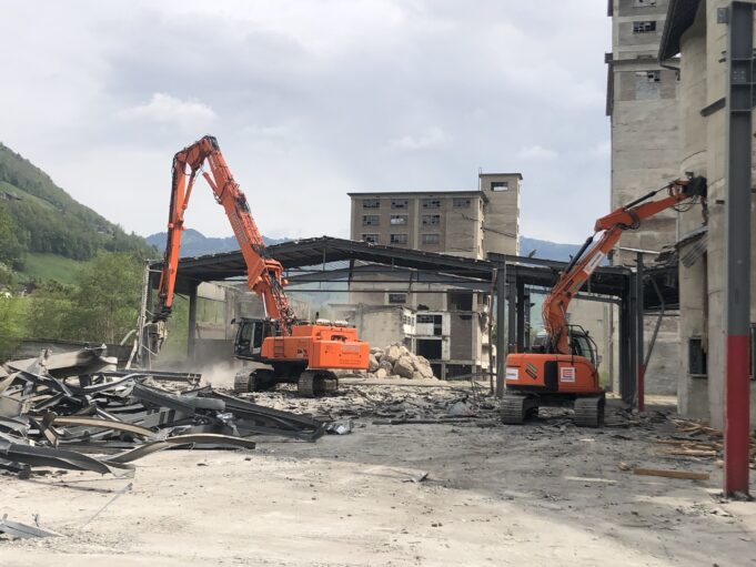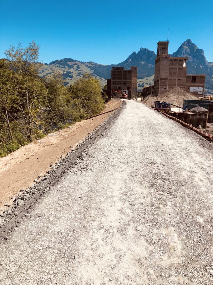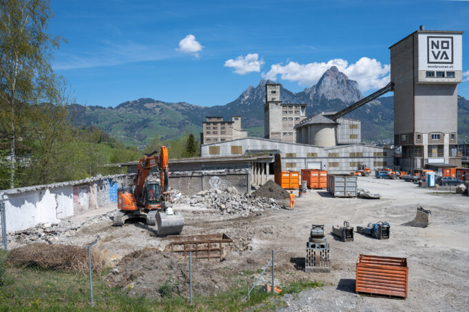 Das ehemalige Zementwerk-Areal in Brunnen soll revitalisiert und in ein neues Quartier (NOVA) umgestaltet werden. Aus diesem Grund mussten die bestehenden Gebäude, Produktions-, Lagerhallen und das Zementsilo abgebrochen werden. Der bestehende Damm wurde erhöht und als Hochwasserschutz gegenüber dem Gewässer (Muota) verstärkt und ausgebaut. Während der ganzen Bauzeit wurde der Hochwasserschutz mittels Swissblock-Elementen gewährleistet.