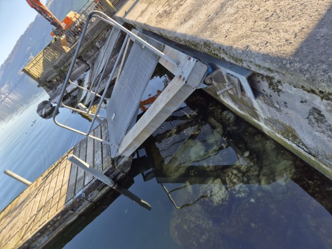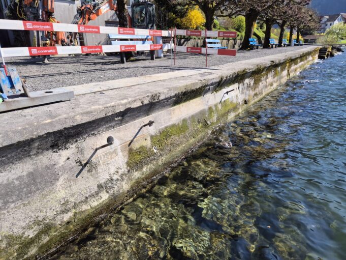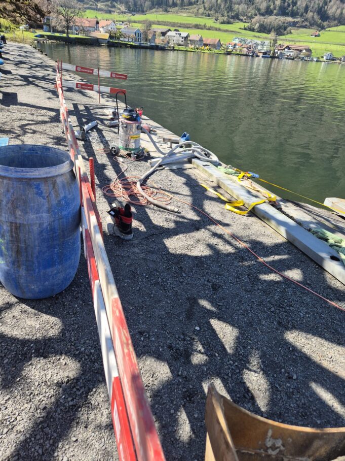 Nach starkem Wellenschlag wurde der bestehende Bootssteg aus seiner Verankerung gerissen. Unser Spezial-Tiefbauteam übernahm die fachgerechte Instandstellung. Es wurden vier Anker des Typs R32 Inox gebohrt und versetzt sowie der Bootssteg anschliessend neu montiert.